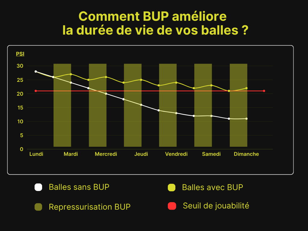 Notre système recrée les conditions idéales en restituant la pression originale (28 PSI), prolongeant ainsi leur durée de vie de 2 fois minimum. Tant que la balle n’est pas trop usée elle peut être regonflée. Avec BUP vous ne jetterez plus jamais de balles par manque de pression.